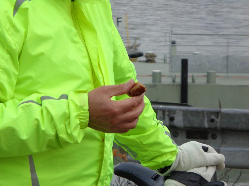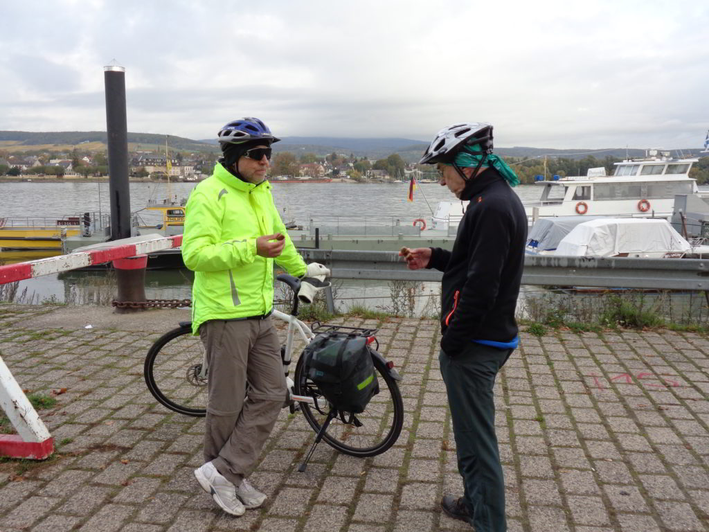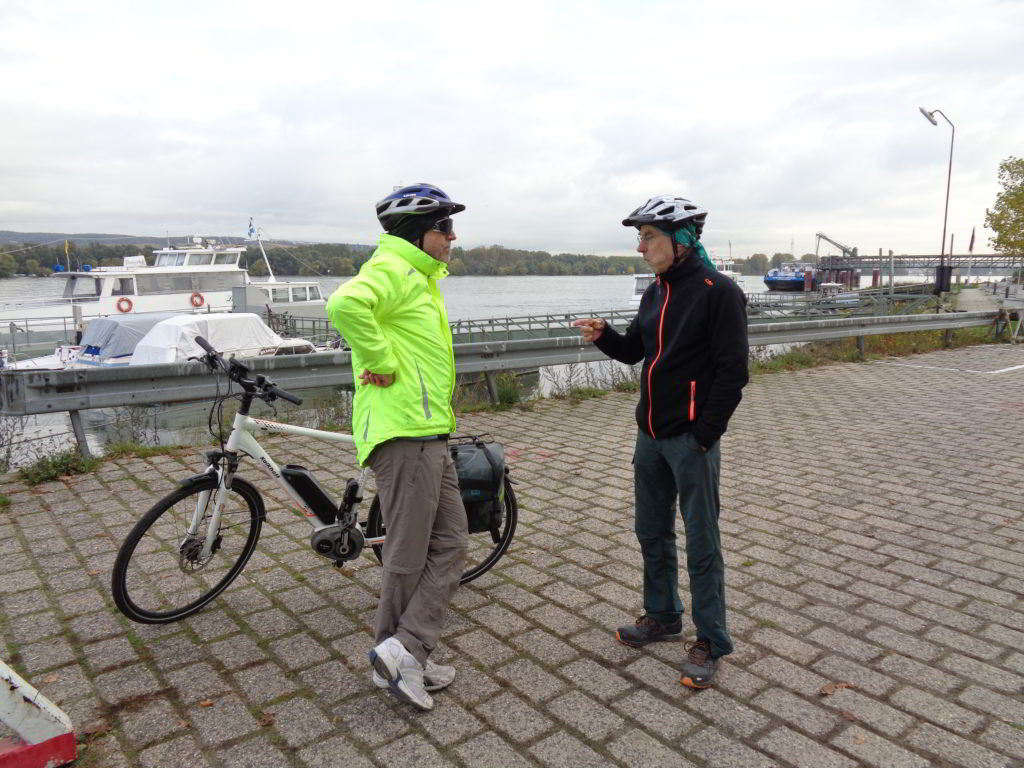 Wie gesagt: Rast am Rheinufer in Budenheim! Mit kalten Füßen stehe ich hier!!! Die beiden haben wohl gewusst, dass ich eine süße Wegzehrung dabei habe? Warum sonst die frühe Rast?