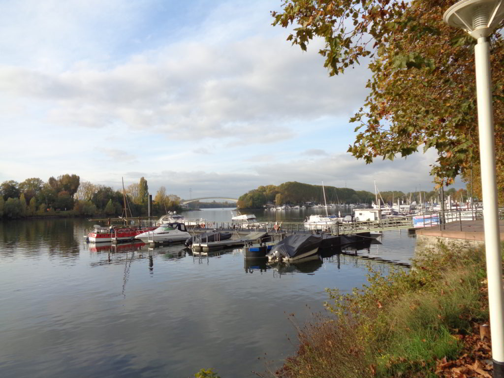 Die Wartezeit vertreiben wir uns mit einem Rundblick. Unser Treffpunkt „Schiersteiner Hafen“ zeigt sich von seiner schönsten Seite. Der Regen gönnt sich eine Pause. Was will man mehr?
